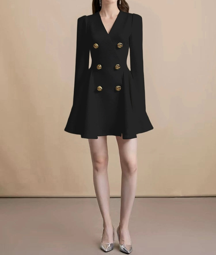 Vestito corto con bottoni decorativi, chiusura con zip.