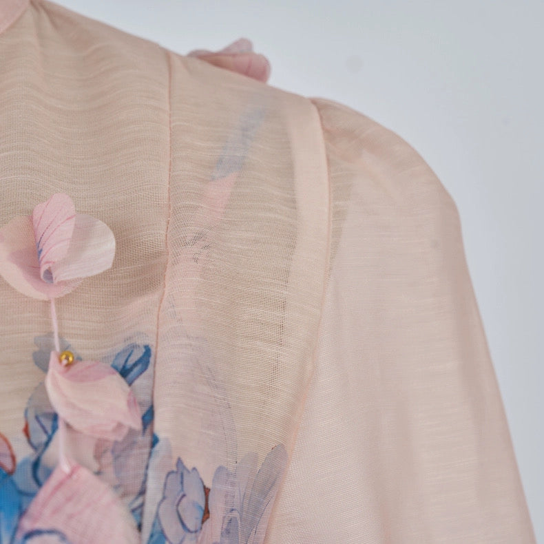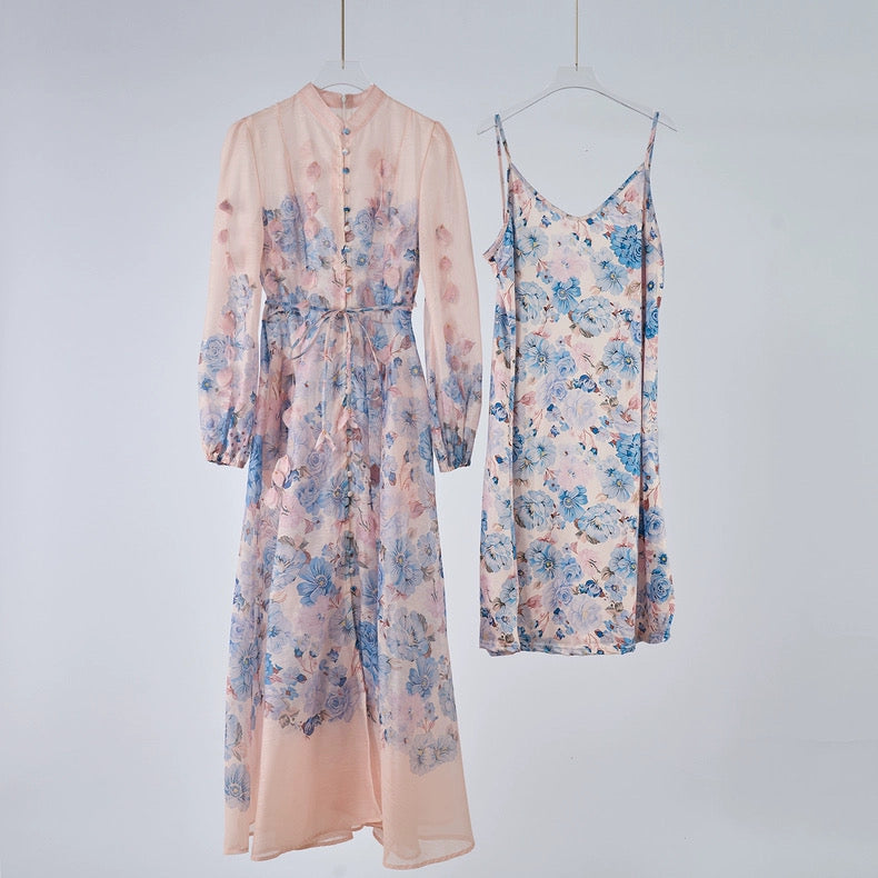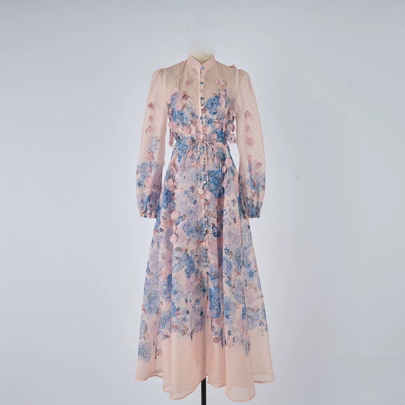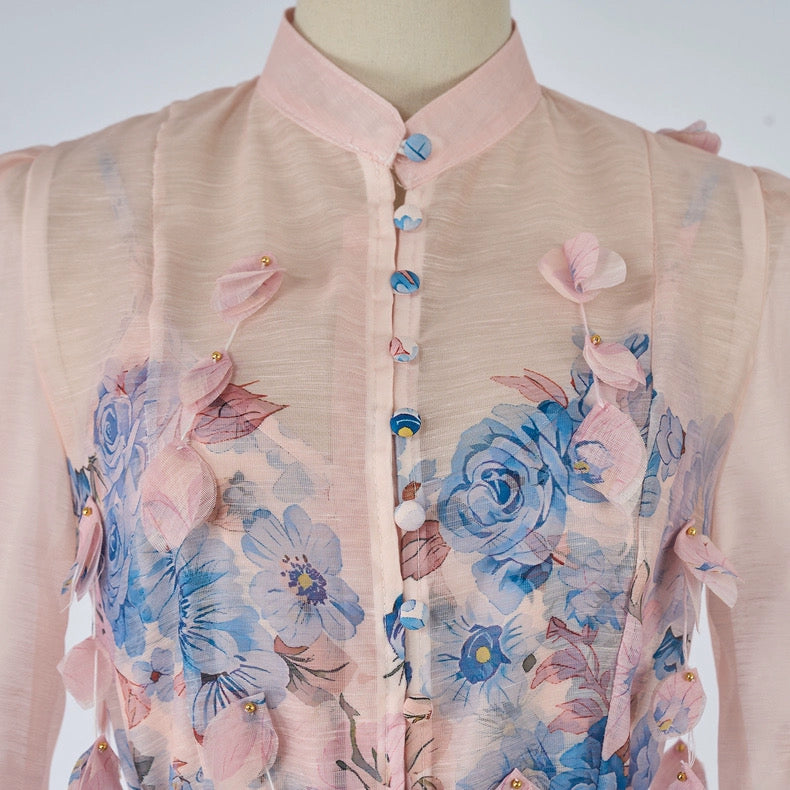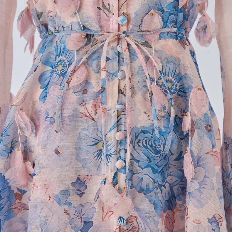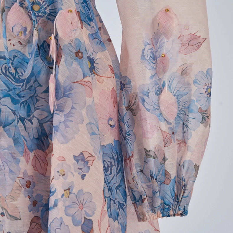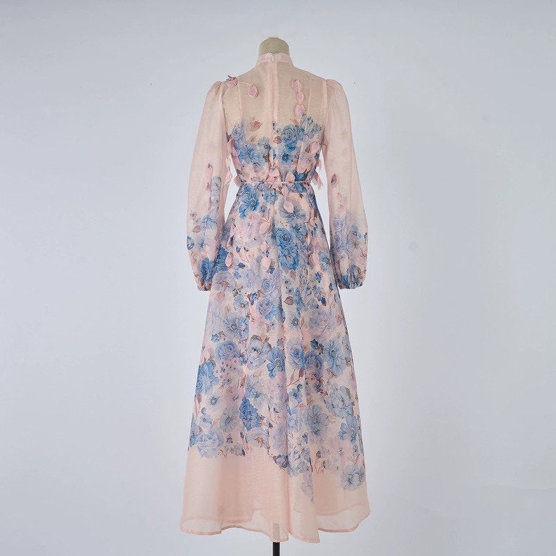 Maniche lunghe a sbuffo, cintura tono su tono.