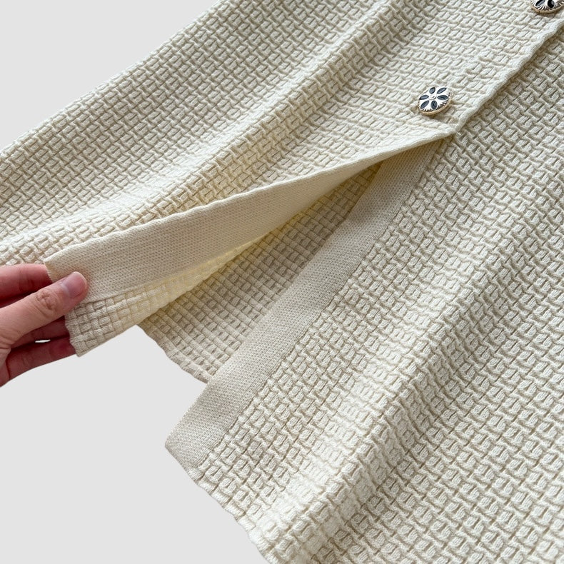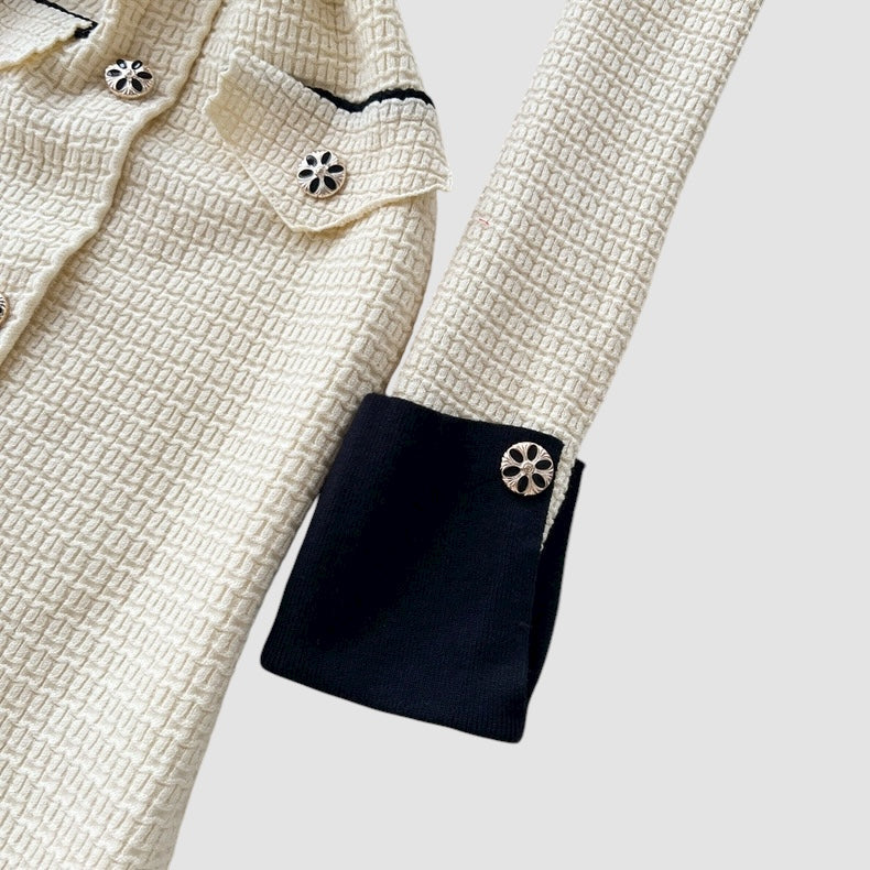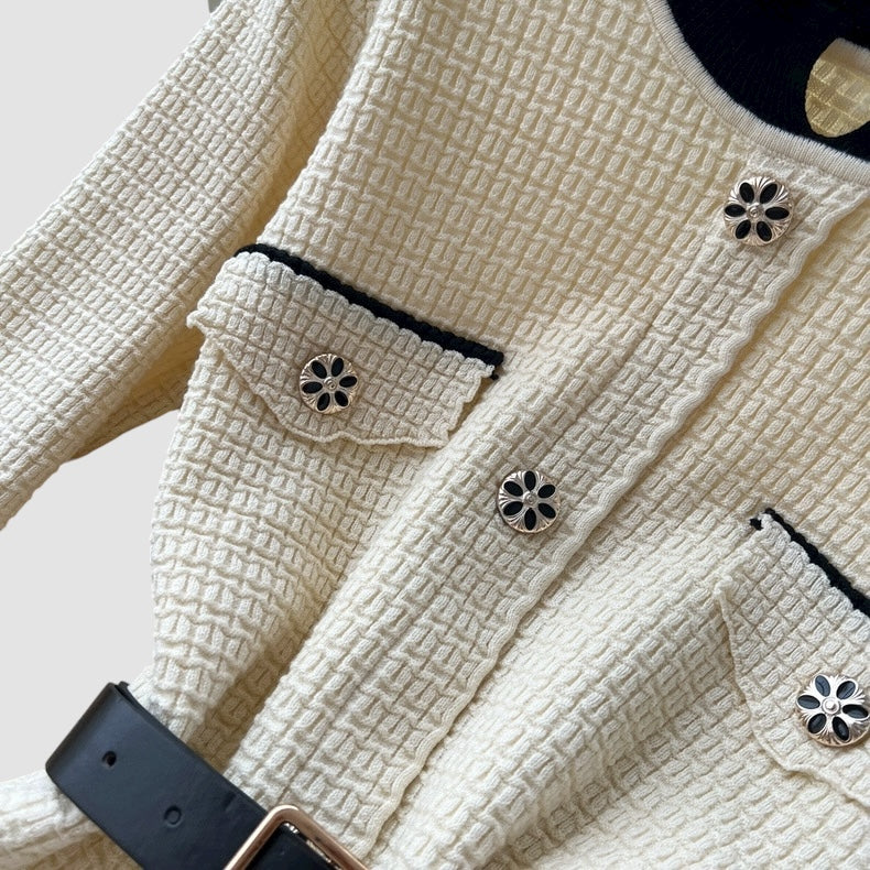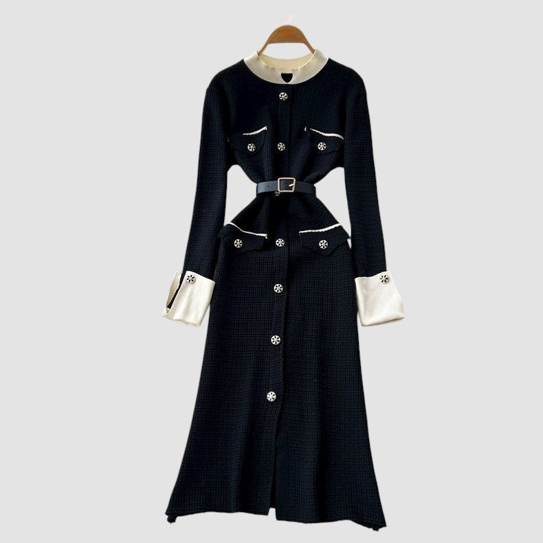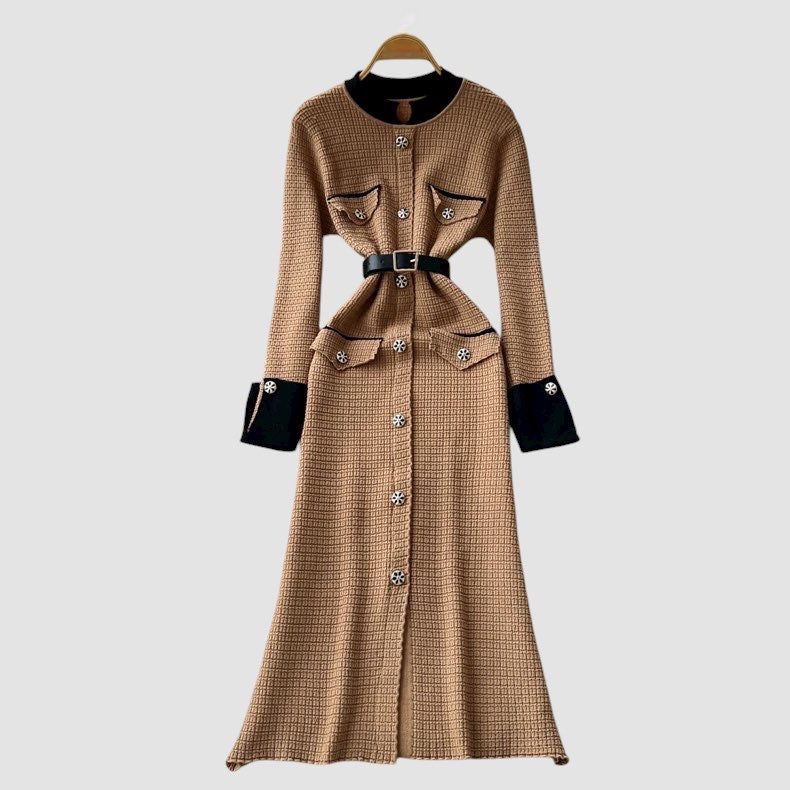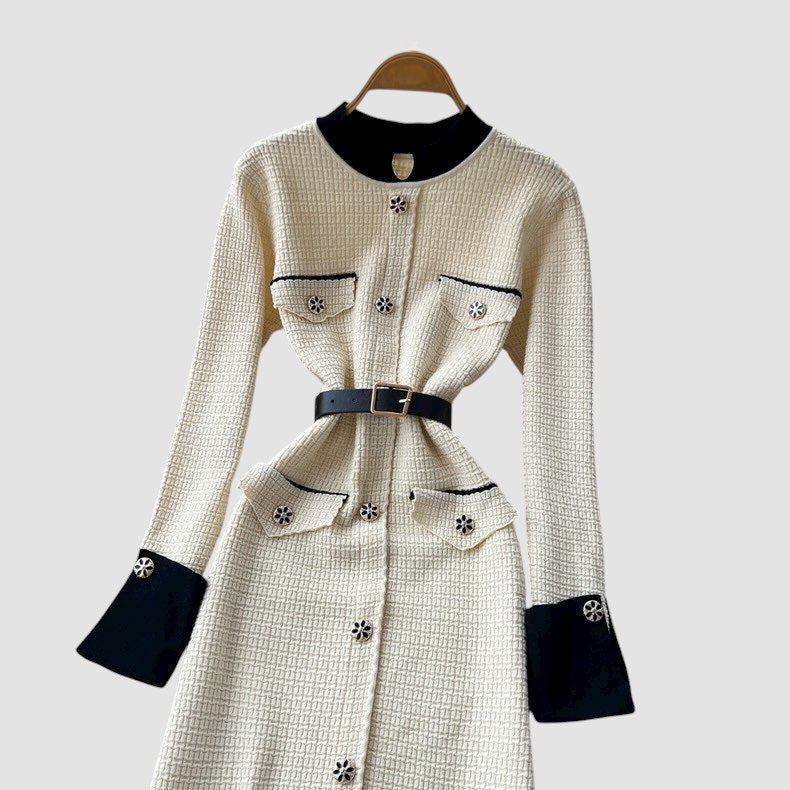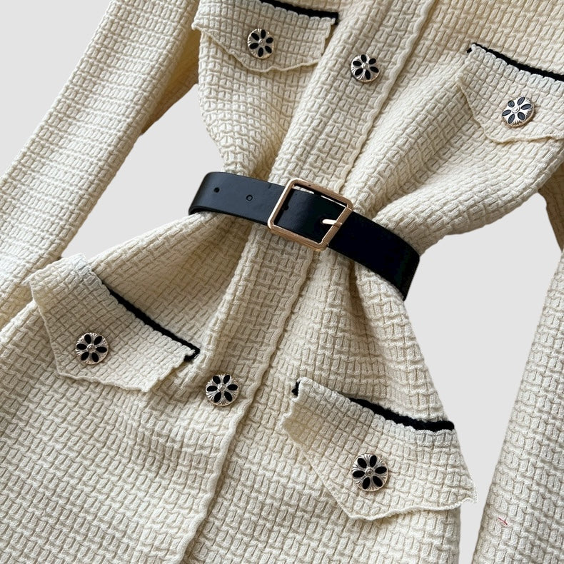 Manica lunga, bottoni decorativi a gioiello, cintura in vita.